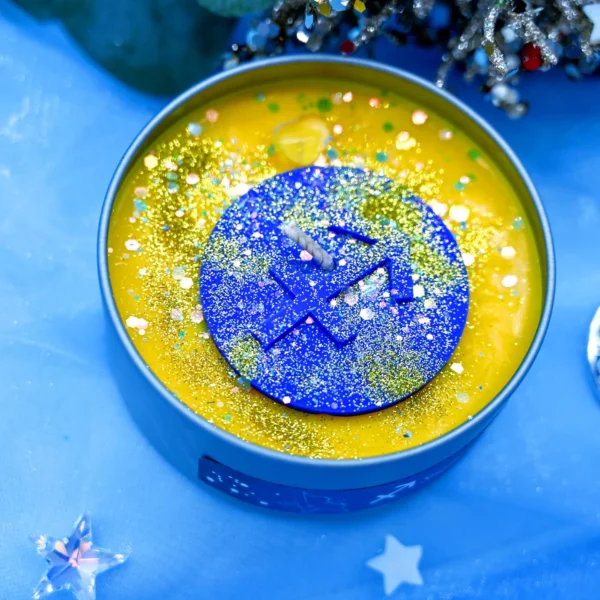 Das Duftöl im Wachs ist eine Komposition von Sandelholz und schwarzem Pfeffer. (Keine Angst, es besteht keine Niesgefahr. 😉 Stattdessen ist der Geruch leicht würzig.) Geziert wird die goldgelbe Kerze vom königsblauen Symbol des Schützen, Glitzer und einem Mondstein. Durch das Kunststoffsichtfenster im Deckel ist die Kerze auch geschlossen ein echter Hingucker, was durch das passende Schmuckband noch verstärkt wird.